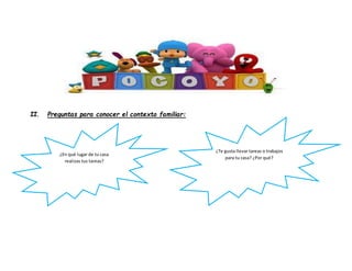 Este documento contiene preguntas para una encuesta sobre un niño. Se piden detalles personales como el nombre y la edad. También se hacen preguntas sobre el contexto familiar como dónde hace las tareas y si le gustan. Finalmente, se incluyen preguntas sobre la escuela como quién lo ayuda a estudiar, su lugar favorito y actividades preferidas.