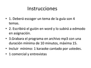 Las instrucciones indican que los estudiantes deben escoger un tema de la guía, grabar un podcast de 10 a 15 minutos incluyendo un karaoke, comercial y entrevistas, y subir el guión y archivo de audio a Edmodo. El guión debe incluir el nombre del programa, los integrantes, la materia y el nombre del archivo de audio.