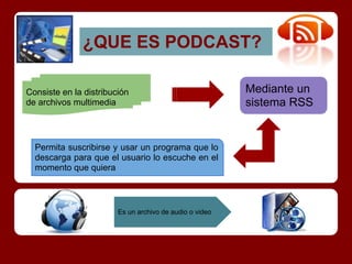 Este documento describe qué son los podcasts. Los podcasts consisten en la distribución de archivos de audio o video a través de RSS que permiten a los usuarios suscribirse y descargarlos para escucharlos cuando quieran. Los podcasts tienen la posibilidad de descargar contenido de audio o video y varían en calidad dependiendo del formato. Permiten la comunicación entre profesores y estudiantes, y pueden usarse como apoyo educativo para proyectos, entrevistas y para estudiantes con necesidades especiales.