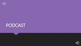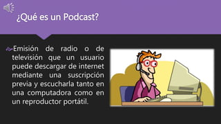 Un podcast es una emisión de radio o televisión que los usuarios pueden descargar de Internet mediante una suscripción previa y escuchar en una computadora o reproductor portátil. Los podcasts sirven para transmitir información sobre temas específicos y para el aprendizaje autodidacta. Para crear un podcast se necesita una aplicación gratuita llamada Audacity con la que se graba el audio de la voz y luego se guarda y exporta el archivo.
