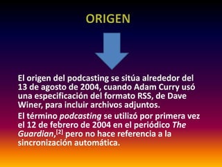El podcasting consiste en la distribución de archivos multimedia a través de RSS que permite suscribirse y descargarlos para escuchar cuando se quiera. Se originó en 2004 cuando Adam Curry usó RSS para incluir archivos adjuntos. Los podcasts tienen contenido diverso como personas hablando sobre temas y pueden escucharse desde la página web o descargarse para usar con reproductores mp3. Se pueden almacenar en servidores o usar servicios de alojamiento especializados en podcasting.