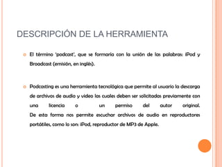 El documento describe el podcasting como una herramienta tecnológica que permite descargar archivos de audio y video previamente autorizados. Se usa comúnmente en educación para compartir conocimientos entre estudiantes y profesores. La propuesta es implementar podcasting en el aula para desarrollar habilidades comunicativas en los estudiantes a través de producciones creativas orales.