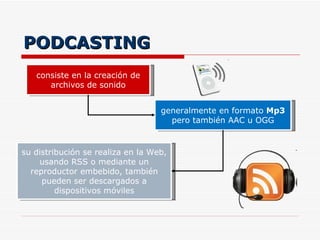 El documento habla sobre los podcasts, que consisten en archivos de audio como MP3 que se distribuyen en la web mediante RSS o un reproductor embebido. Explica cómo producir un podcast grabándolo con un dispositivo y editándolo con software de edición de audio, y luego alojándolo en servicios online que permiten incrustarlo en blogs. También menciona usos educativos como apoyo para el aprendizaje y cómo los estudiantes pueden crear sus propios contenidos a través de podcasts.