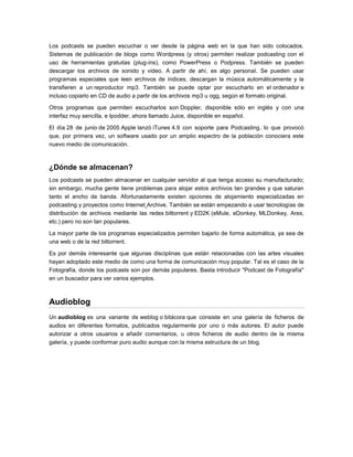 El podcasting consiste en la distribución de archivos multimedia a través de RSS que permite a los usuarios suscribirse y descargar contenido como podcasts para escuchar cuando quieran. Los podcasts cubren una variedad de temas como noticias, música y entrevistas. Se pueden escuchar a través de sitios web, programas especializados o iTunes y almacenar en servidores u opciones de alojamiento dedicadas a podcasts.