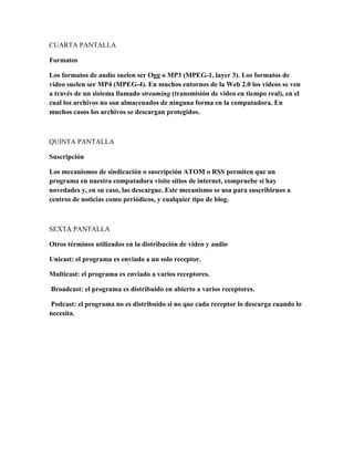 Este documento define los podcasts y sus usos pedagógicos. Explica que un podcast es un archivo de audio o video que puede descargarse de Internet y suscribirse para descargas automáticas en dispositivos móviles. Detalla los requisitos técnicos de los podcasts y sus formatos, así como los mecanismos de suscripción. Finalmente, analiza usos positivos como grabar clases para estudiantes que faltan, y negativos como la baja calidad si no se usan recursos comunicativos.