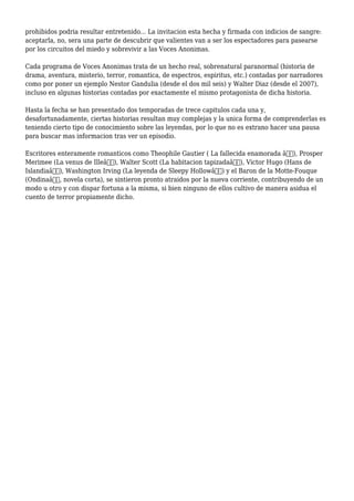El documento presenta el libro 'Voces Anónimas: relatos y leyendas del universo fantástico' de G. Lockhart, que narra tres historias de personajes en circunstancias laborales diversas. A través de cuentos de terror más accesibles para un público infantil, se exploran temas de superstición y el terror oculto en las narrativas. Además, se menciona la influencia de autores románticos en la recopilación y creación de leyendas a lo largo del tiempo.