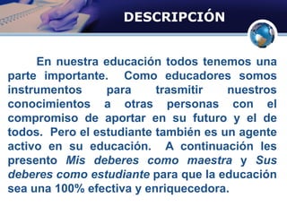 La profesora María Matos Torres presenta sus deberes como maestra y los deberes de los estudiantes para lograr una educación efectiva. Como maestra, se compromete a motivar el aprendizaje, ofrecer tiempo para pensar, explicar claramente las lecciones y tareas, y crear un ambiente propicio para el aprendizaje. Los estudiantes deben participar activamente en clase, hacer sus tareas, estudiar para los exámenes, y seguir las reglas establecidas.