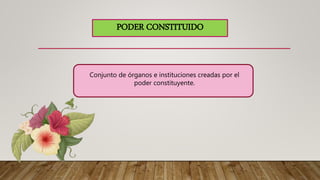 El documento describe la diferencia entre el poder constituyente y el poder constituido. El poder constituyente es la soberanía del pueblo para establecer la constitución y estructura política del estado. El poder constituido son las instituciones creadas por la constitución como el poder ejecutivo, legislativo y judicial, los cuales gobiernan el estado de acuerdo a las leyes establecidas. El poder constituyente proviene de la teoría revolucionaria francesa del siglo XVIII.