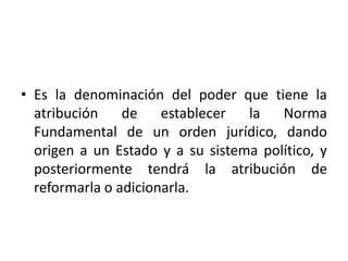 Este documento describe la diferencia entre el poder constituyente originario y derivado. El poder constituyente originario se ejerce cuando se crea un nuevo estado o cuando se reemplaza completamente la constitución vigente, y tiene poderes ilimitados. El poder constituyente derivado solo puede reformar la constitución existente siguiendo los procedimientos establecidos en ella.