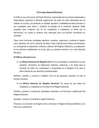 El documento describe las diferentes instituciones que componen el Poder Electoral en Venezuela. El Consejo Nacional Electoral es el ente rector responsable de los procesos electorales y referendos. La Junta Nacional Electoral se encarga de la dirección, supervisión y control de los procesos electorales. Existen también organismos electorales subalternos a nivel regional, municipal y parroquial.