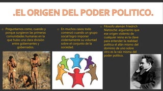 1) El documento explora el origen y la legitimidad del poder político, discutiendo cómo surgieron las primeras comunidades con gobernantes y gobernados y si ese poder es legítimo. 2) Examina las teorías de Nietzsche sobre el origen violento del poder político y diferentes tipos de origen e legitimidad de las instituciones. 3) También distingue entre estado y sociedad civil, y analiza conceptos como tipos de dominio, clases de legitimación y formas de organización política.
