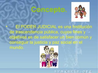 El Poder Judicial es una institución pública cuyo objetivo principal es administrar justicia y lograr la paz social de acuerdo a las normas constitucionales. Tiene la finalidad de aplicar el sistema de justicia de forma rápida y simplificada para evitar la burocracia. Está formado por una estructura legal que debe obedecer la ley y una estructura orgánica jerárquica.
