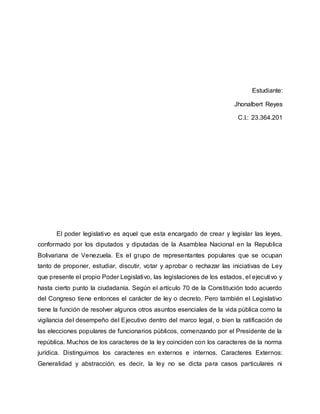 El documento describe las funciones del poder legislativo en Venezuela. Explica que el poder legislativo está encargado de crear y legislar las leyes a través de la Asamblea Nacional. También tiene la función de supervisar al poder ejecutivo y ratificar elecciones. El documento luego discute varios tipos de leyes como las leyes orgánicas, las leyes habilitantes y la reserva de ley.
