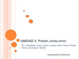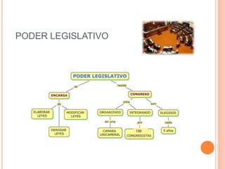 Este documento proporciona una introducción al poder legislativo y al Congreso de Perú. Explica que el Congreso opera bajo los principios de la democracia y la representación política, y tiene las atribuciones de legislar, fiscalizar y representar. También describe las funciones del Congreso, el proceso legislativo, la delegación de poderes legislativos al ejecutivo, y las funciones de fiscalización y representación del Congreso.