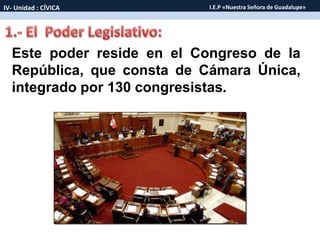 El documento describe las características del poder legislativo y judicial en Perú. El poder legislativo reside en el Congreso de la República, compuesto por 130 congresistas elegidos cada cinco años. Los congresistas no pueden tener otra función pública, excepto ser ministro. El poder judicial está conformado por la Corte Suprema, Cortes Superiores y juzgados, y es responsable de administrar justicia de acuerdo a las leyes y la constitución.