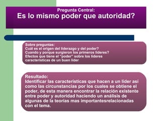 El documento analiza la relación entre poder y autoridad. Explora el origen del liderazgo y cómo surgieron los primeros líderes. Examina cómo el poder afecta a los líderes y las características de un buen líder. Concluye que poder y autoridad no son conceptos opuestos, y que un líder es alguien que tiene poder, independientemente de cómo lo haya adquirido.