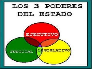 El documento describe los tres poderes del estado en Perú: el poder ejecutivo, encabezado por el presidente, aplica las leyes; el poder legislativo, conformado por el Congreso de la República por 5 años, aprueba leyes y reformas constitucionales; y el poder judicial, un organismo autónomo con jueces que resuelven conflictos y juzgan delitos.