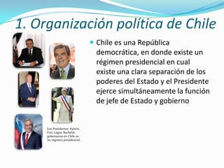 Chile es una república democrática con un régimen presidencial. Los poderes públicos en Chile son independientes entre sí: el poder ejecutivo, el poder legislativo y el poder judicial. El poder ejecutivo recae en el Presidente, el poder legislativo en el Congreso Nacional y el poder judicial en la Corte Suprema. A nivel regional, las subdivisiones son las regiones, provincias y comunas.