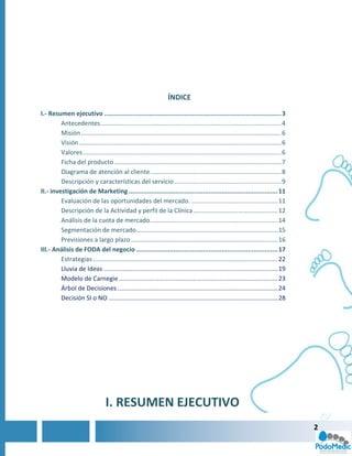 Este documento presenta un resumen ejecutivo y análisis de mercado para un nuevo centro de atención al pie llamado "Podomedic" en Puebla, México. Brevemente describe la misión, visión y valores de la clínica, así como su historia, servicios y ficha técnica. Luego, analiza las oportunidades del mercado local, la segmentación del público objetivo y la competencia. El documento proporciona una descripción general del nuevo negocio de servicios podológicos y su análisis de viabilidad com