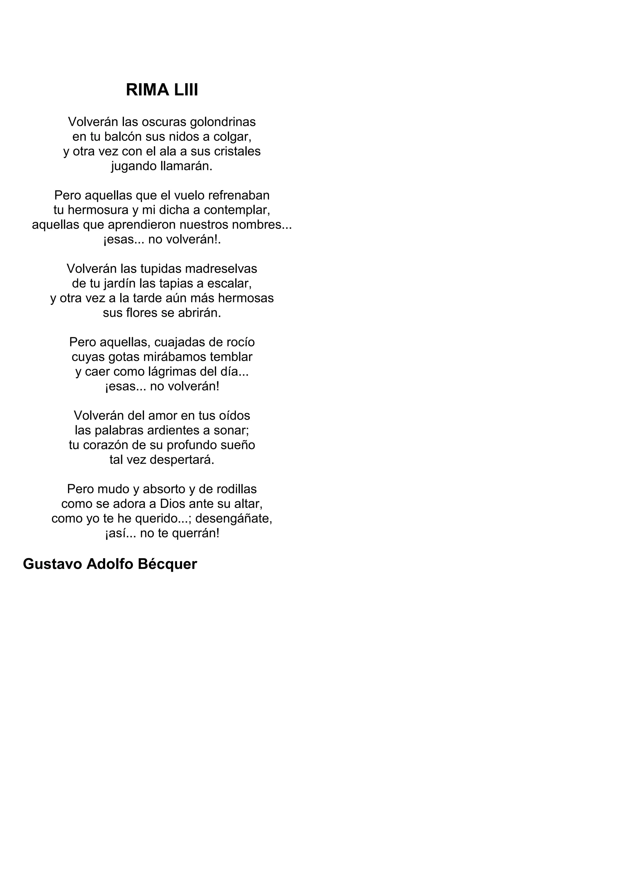 Este poema de Gustavo Adolfo Bécquer describe cómo aunque algunas cosas regresarán, como las golondrinas al balcón o las flores al jardín, otras cosas no volverán, como las golondrinas que contemplaban la belleza de la amada o las flores cubiertas de rocío. El poema concluye diciendo que aunque palabras de amor puedan sonar en los oídos de la amada, nadie la amará de la manera devota y silenciosa en que el poeta la amó.