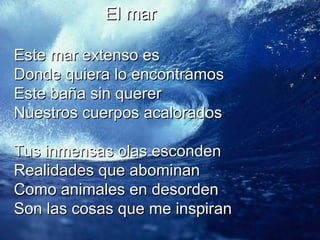 El poema describe al mar como un cuerpo de agua extenso que se encuentra en todas partes y que refresca a los cuerpos calientes. Aunque el mar es hermoso, también esconde realidades que son repugnantes como animales desordenados. El autor encuentra inspiración en los sonidos del mar por la mañana y se maravilla con la flora y fauna marinas que cuentan historias. El poema termina preguntando por qué no cuidamos este mar grandioso, sensible y precioso que nos provee de mucho.