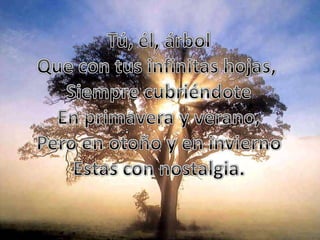 El poema describe un árbol que ofrece sombra y felicidad a través de las estaciones. En primavera y verano el árbol está lleno de hojas que lo cubren, pero en otoño e invierno siente nostalgia al estar desnudo. A pesar de los cambios estacionales, el árbol siempre extiende sus ramas hacia el cielo y más allá para proveer sombra y felicidad.