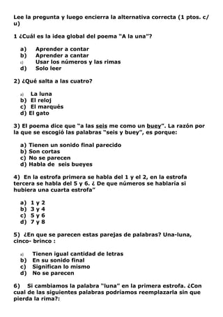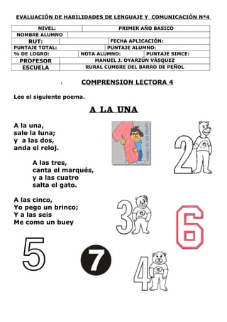 Este documento presenta una evaluación de habilidades de lenguaje y comunicación que incluye una sección de comprensión lectora y una sección de producción de textos. En la primera sección, se presenta un poema para que el estudiante responda preguntas sobre detalles, ideas y relaciones en el texto. En la segunda sección, se pide al estudiante que continúe escribiendo una historia iniciada y le asigne un título. El documento también incluye una tabla para calcular el puntaje y porcentaje de logro del estudiante.