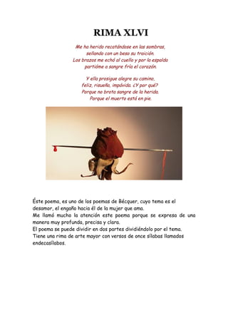 Este poema de Bécquer expresa el desamor y el engaño del poeta por parte de la mujer que ama. En la primera estrofa, el poeta describe cómo fue traicionado con un beso falso mientras ella le partía el corazón. En la segunda estrofa, señala que ella continúa su camino feliz e indiferente a su dolor, a pesar de que él se siente muerto por dentro. El poema utiliza la rima y recursos literarios para transmitir los sentimientos de dolor y traición del poeta.