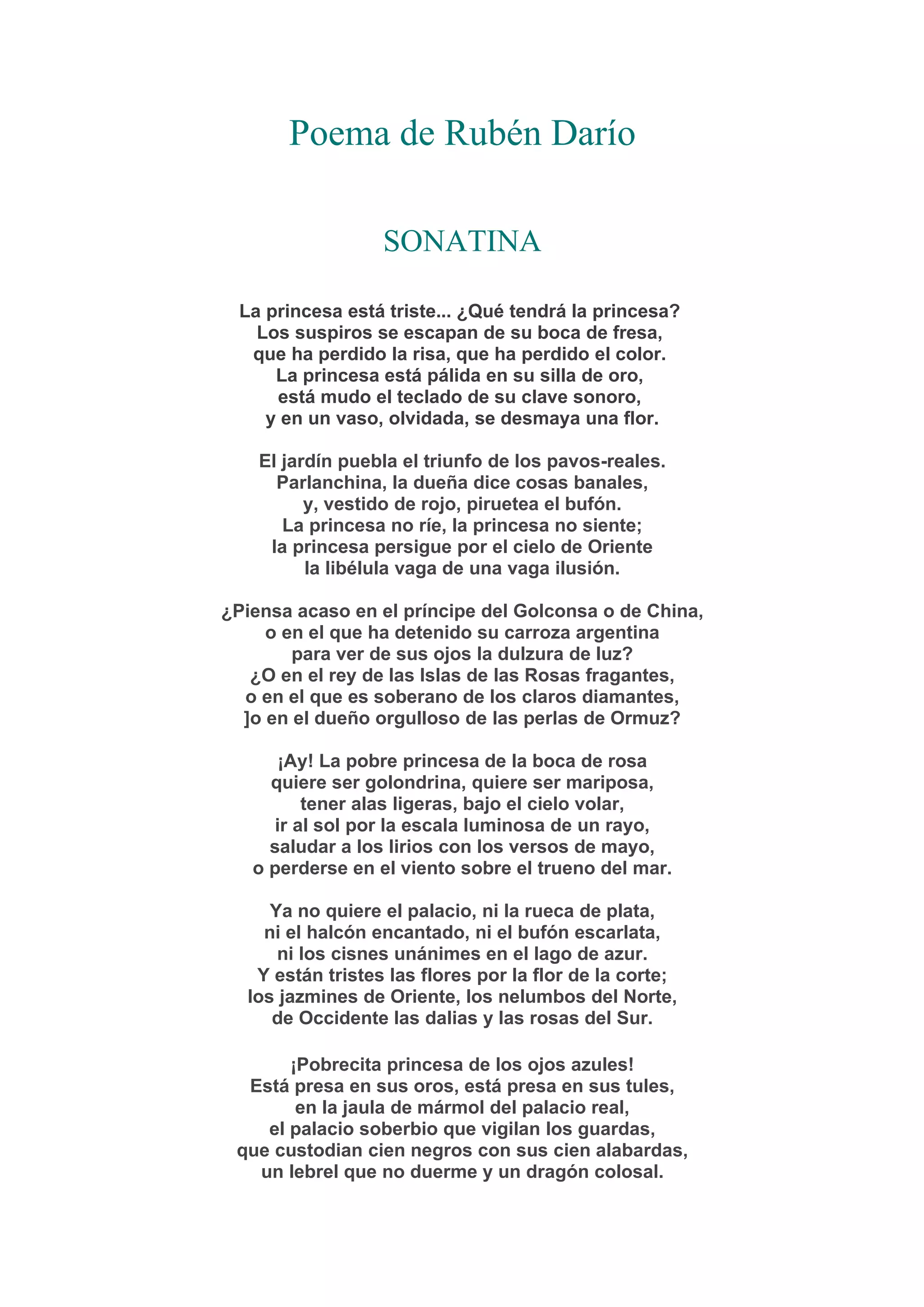 El poema 'Sonatina' de Rubén Darío describe la tristeza de una princesa atrapada en un palacio dorado, anhelando libertad y una vida más alegre. A través de imágenes vívidas, se revelan sus deseos de volar y encontrar un amor ideal que la libere de su cautiverio. La obra evoca temas de melancolía, sueños y la búsqueda de la felicidad.