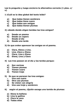 El documento presenta una evaluación de habilidades de lenguaje y comunicación de un alumno de primer año básico. Incluye una sección de comprensión lectora con preguntas sobre un poema, y una sección de producción de textos donde se pide continuar un cuento y asignarle un título.