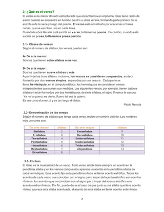 El documento explica los elementos fundamentales de la poesía, incluyendo la estrofa, el verso, y la rima. La estrofa se define como un conjunto de versos con una forma repetida, mientras que el verso es la unidad básica de la poesía. La rima se produce cuando los sonidos finales de los versos coinciden. El documento también analiza un poema de ejemplo y explica cómo contar las sílabas en los versos usando conceptos como la sinalefa.