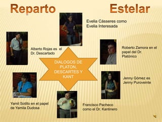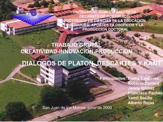 Este documento presenta un trabajo grupal realizado por estudiantes de un doctorado en educación. El trabajo analiza los aportes filosóficos de Platón, Descartes y Kant a través de un diálogo dramático entre los participantes, quienes asumen roles como diferentes filósofos. Al final, se incluye un poema sobre los pensadores mencionados y sus ideas.