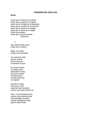 Este poema recopila una serie de poemas anónimos que exploran temas como el amor, la belleza, los recuerdos y la búsqueda de paz y felicidad. Los poemas describen sentimientos de añoranza, pasión, admiración y conexión a través de la naturaleza y la persona amada. El poemario celebra la capacidad del amor y la poesía para dar consuelo y tranquilidad en medio de las vicisitudes de la vida.