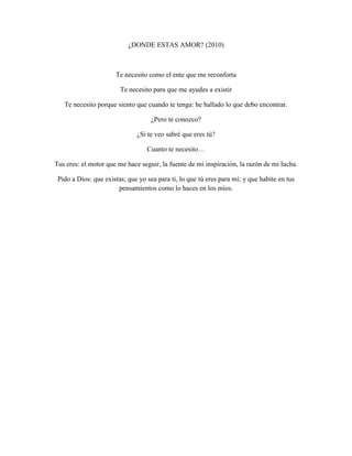 Este documento contiene varios poemas y reflexiones sobre el amor y el sufrimiento que conlleva estar enamorado de alguien que no se puede tener. El autor expresa su deseo por una mujer que atrapa su mente y corazón, la necesidad de tenerla para sentirse completo, y le pide a Dios encontrar la cura para dejar de amarla ya que su amor le causa dolor.