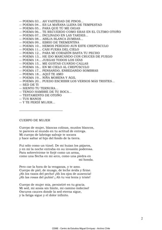 Este documento presenta una biografía y una selección de poemas del poeta chileno Pablo Neruda. Brevemente describe su vida y obra, destacando que nació en 1904, adoptó el seudónimo Pablo Neruda en 1917, y fue galardonado con el Premio Nobel de Literatura en 1971. Además, incluye extractos de varios de sus poemas de amor más conocidos.