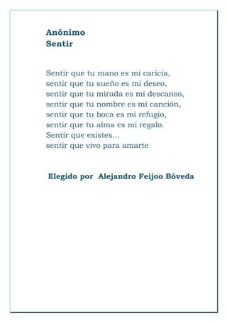 Este documento presenta una colección de poemas ilustrados realizados por estudiantes de 1o de ESO. Incluye poemas anónimos y de autores como Antonio Machado, Alberto Girri y Federico García Lorca. Los poemas tratan sobre temas como el amor, la naturaleza, los sentimientos y la poesía misma. El documento muestra la creatividad literaria de los estudiantes y su apreciación por la poesía.