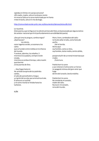 Este poema describe la experiencia de un niño durante una guerra a través de tres oraciones. En la primera oración describe la suspensión de clases y el miedo que sentía. En la segunda oración menciona descubrir sangre y ver el dolor de los adultos. En la tercera oración explica que aunque todo ha pasado, aún recuerda ese miedo difuso y esas ganas repentinas de llorar.