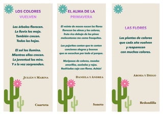 Este documento contiene varios poemas cortos escritos por estudiantes de 6o grado sobre la primavera. Los poemas describen aspectos como las flores, los árboles, los pájaros, el clima y la naturaleza renaciendo durante esta estación. Los estudiantes utilizan diferentes formas poéticas como cuartetos, redondillas y sonetos para expresar la belleza y la alegría de la primavera.