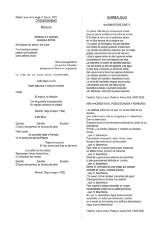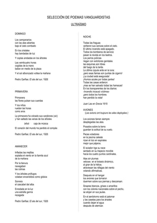 Este documento presenta una selección de poemas vanguardistas de diferentes movimientos como el ultraísmo, el creacionismo, el surrealismo, el futurismo y el dadaísmo. Cada poema explora temas como la naturaleza, la ciudad, el amor y la infancia desde una perspectiva experimental con el lenguaje y la forma poética. Los poemas utilizan imágenes evocadoras y juegos de palabras para transmitir sensaciones e ideas de una manera no convencional.