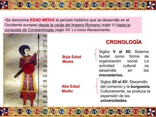 El documento resume la literatura de la Edad Media en Europa occidental. La sociedad se organizó según el feudalismo y la cultura fue teocéntrica, con la Iglesia Católica transmitiendo el latín. Convivieron las culturas cristiana, árabe y judía. La literatura fue anónima y oral al principio, desarrollándose la lírica popular y culta y la épica como el Cantar de Mío Cid. Más tarde surgió la poesía narrativa culta como el Libro de Buen Amor de Juan Ruiz que trata sobre el am