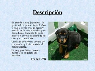 Los estudiantes de 7°B escribieron poemas y descripciones sobre sus mascotas para celebrar el Día del Animal. Algunos poemas describen la personalidad cariñosa y juguetona de una perra llamada Luna, la amistad entre un niño y su perrito, y el amor por un gato blanco de ojos verdes. Los estudiantes expresan su aprecio y agradecimiento por el amor incondicional de sus mascotas.