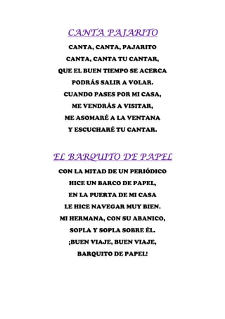 Este documento contiene varios poemas infantiles sobre temas como el aseo personal, el día de la madre, actividades al aire libre como ir a la playa, las estaciones del año como la primavera y el otoño, así como poemas sobre partes del cuerpo y la escuela. Los poemas utilizan lenguaje sencillo y rimas para hablar de estas experiencias y temas cotidianos de una manera entretenida para los niños.