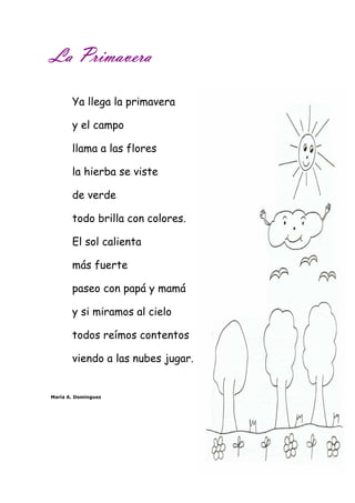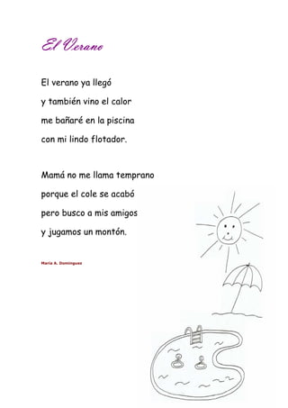 Este documento presenta una colección de poemas cortos para niños escritos por María A. Domínguez. Los poemas cubren temas como las estaciones, la familia, el paisaje y eventos especiales. El documento explica que los poemas son apropiados para niños de 3 a 8 años y pueden usarse para motivar e inspirar a los niños, tanto en la escuela como en casa.