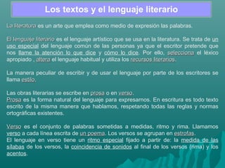 Este documento describe los elementos básicos de la poesía. Explica que la poesía utiliza el lenguaje literario y versos para crear ritmo y rima. Describe diferentes tipos de estrofas como el terceto, cuarteto y soneto. También explica recursos literarios como la metáfora, hipérbole e ironía que los poetas usan para darle significado y expresividad a sus obras.