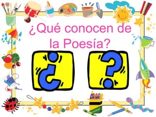 Este documento presenta una introducción a la poesía. Define la poesía como un género literario que expresa belleza y sentimientos a través de palabras y genera emociones en el lector. Explica los tipos principales de poesía como poesía dramática, lírica y épica. También describe características como la métrica, estrofa, verso, rima y prosa poética. Por último, ofrece instrucciones sobre cómo elaborar una poesía propia.