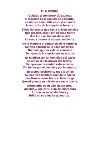 El maestro de la escuela es un obrero admirable que levanta la antorcha de la ciencia. Es un sabio ignorante que procura encender una luz en cada frente que ilumine la senda oscura de la vida. Como sufrido apóstol de la edad moderna, dirige sus pasos hacia el bien a pesar de su oscura posición y pobreza habitual.