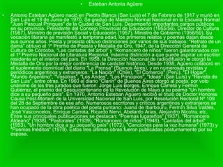Este documento presenta información biográfica y una selección de obras del poeta argentino Esteban Agüero. Detalla eventos clave en su vida y carrera, incluyendo cargos públicos y reconocimientos literarios. Luego, analiza tres poemas de Agüero, describiendo temas, estructura métrica, imágenes y función del lenguaje. Finalmente, incluye una bibliografía de referencias sobre el autor.