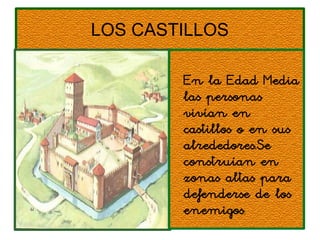 El documento describe aspectos de la vida en la Edad Media como los castillos, sus habitantes y partes, las diversiones como los torneos y banquetes, y los caballeros, incluyendo su entrenamiento y equipamiento con armadura y armas.