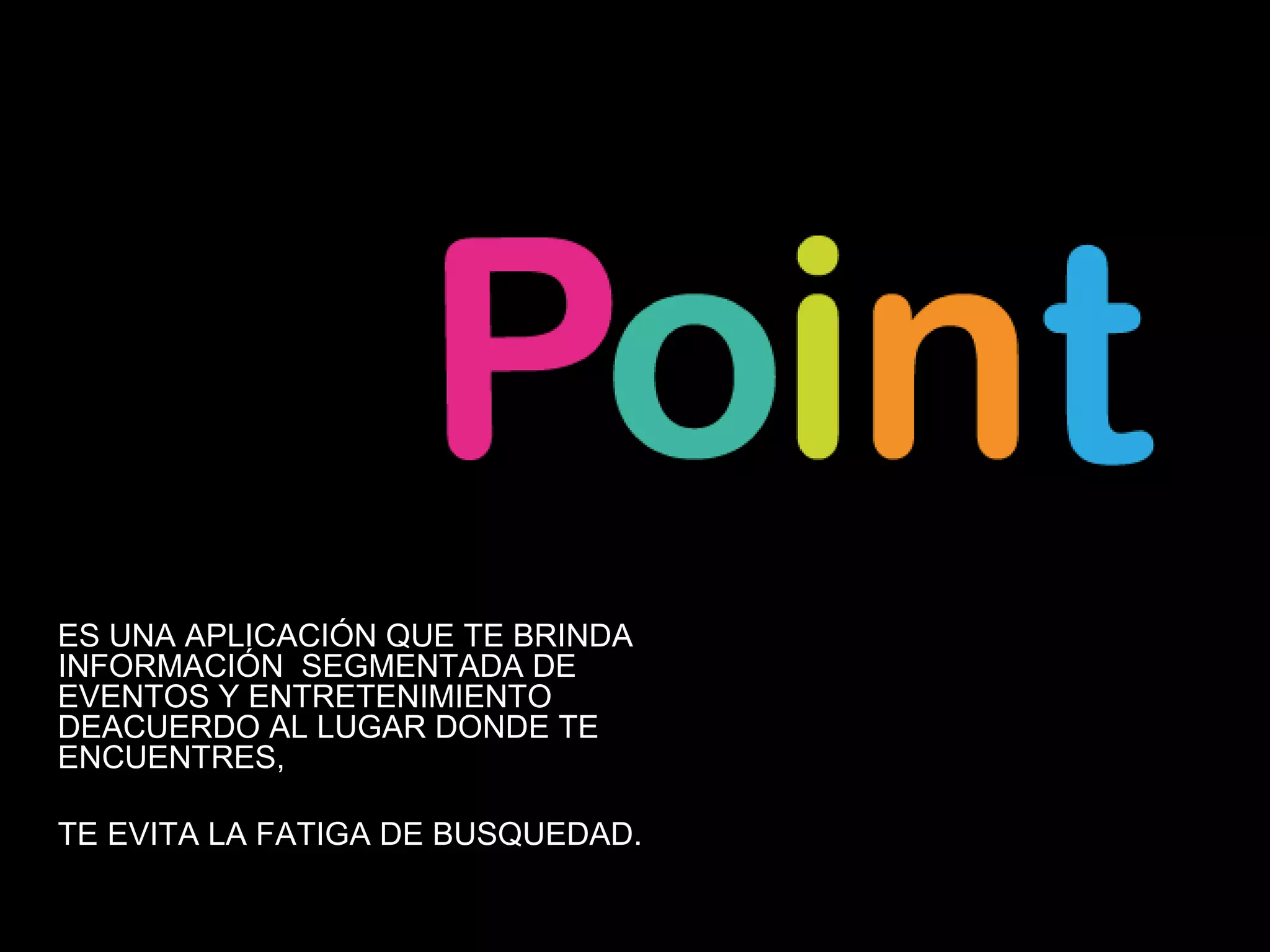 Este documento describe una aplicación llamada "Point" que brinda información sobre eventos y entretenimiento en la ubicación del usuario para evitar la fatiga de buscar opciones. Los usuarios pueden elegir actividades y lugares indicados para ellos. La aplicación también conecta a los usuarios con taxis para llegar a los destinos seleccionados de manera segura. Se propone publicidad creativa a través de cupones, afiches y merchandising para auspiciadores.