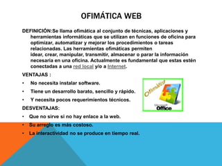 Este documento presenta información personal sobre Diana Lisseth Guamán Hurtado, una estudiante de 18 años de la carrera de Comunicación Social en la Universidad Técnica Particular de Loja. Además, define ofimática web como el conjunto de técnicas y herramientas informáticas utilizadas para optimizar tareas de oficina y mejorar la manipulación, transmisión y almacenamiento de información. Finalmente, explica que un blog es un sitio web que recopila artículos de uno o más autores de forma cronológica, permit